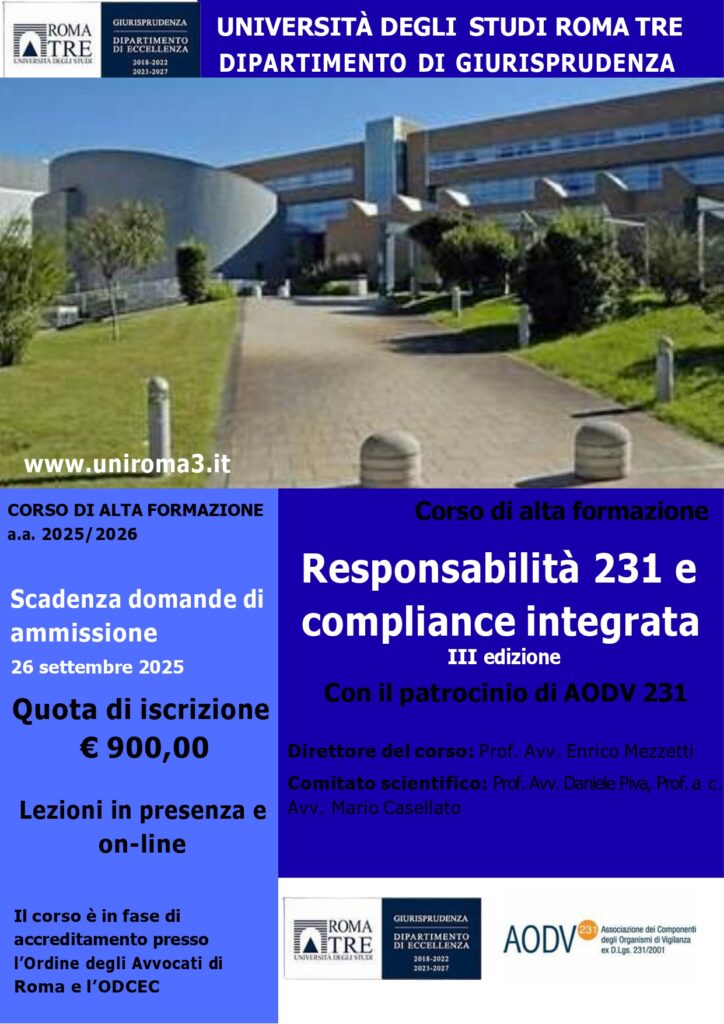 15.11.2025 Mara Chilosi terrà la docenza del prossimo 15 novembre 2025 nell’ambito della terza edizione del Corso di alta formazione “Responsabilità 231 e compliance integrata”, organizzato dal Dipartimento di Giurisprudenza dell’Università degli Studi Roma Tre, con il patrocinio di AODV231.
